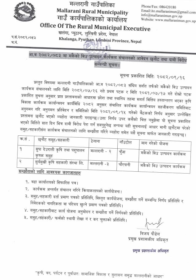आ.व २०८२/०८३ मा मकैको विउ उत्पादन कार्यक्रम सञ्चालनको आवेदन छनौट तथा दावी विरोध सम्बन्धी सूचना ।