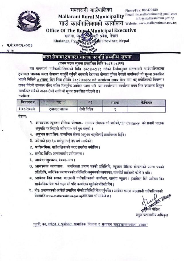 करार सेवामा ट्रयाक्टर चालक पदपूर्ति सम्बन्धी सूचना।