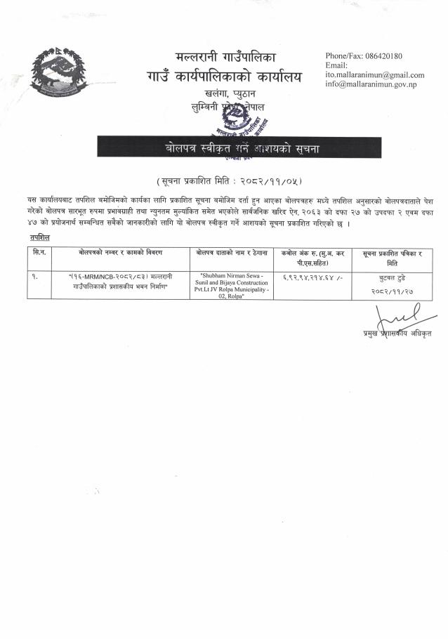 » प्रशासकीय भवन निर्माणका लागि बोलपत्र स्वीकृत गर्ने आशयको सूचना ।
