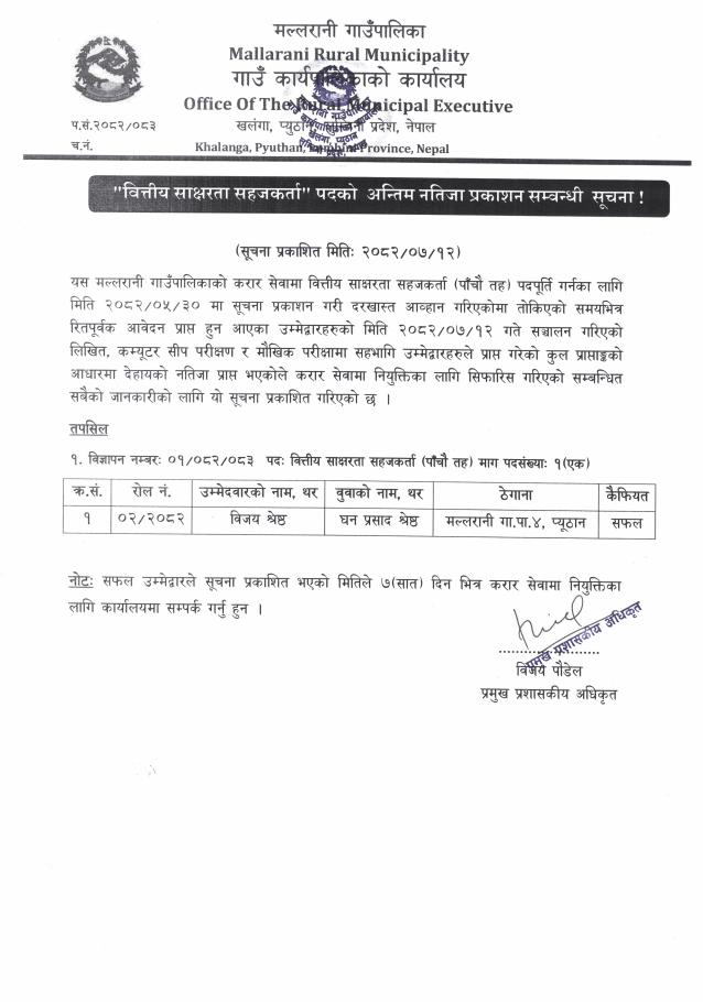 वित्तिय साक्षरता सहजकर्ता सेवा करारको अन्तिम नतिजा प्रकाशन सम्बन्धी सूचना ।