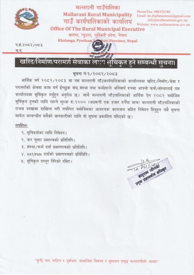 आ.ब २०८२/०८३ मा मल्लरानी गाउँपालिका कार्यालयमा खरिद/निर्माण/परामर्श सेवाका लागि सूचिकृत हुने बारे सूचना।