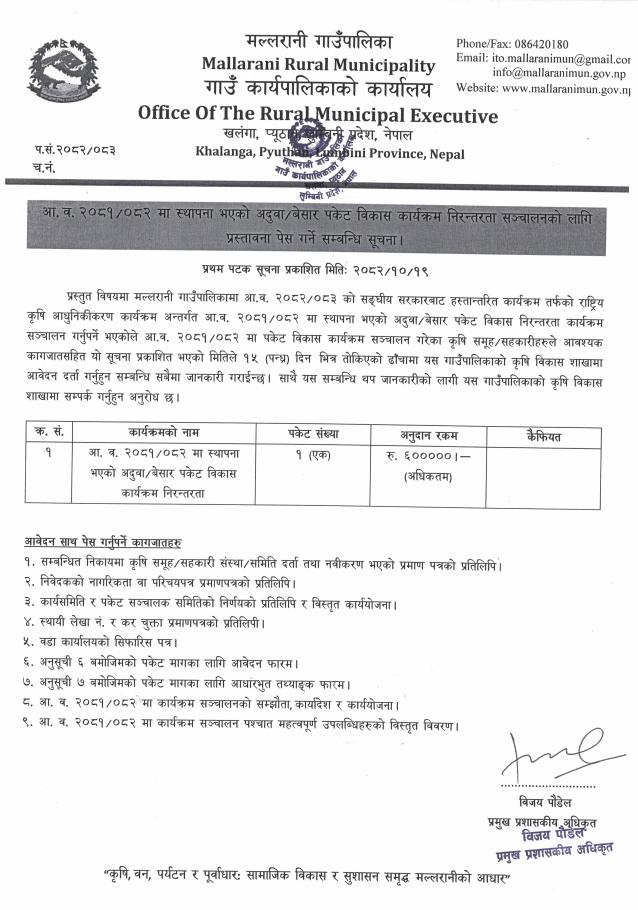 आ.व २०८१/०८२ मा स्थापना भएको अदुवा/बेसार पकेट विकास कार्यक्रम निरन्तरता सञ्चालनको लागि प्रस्तावना पेश गर्ने बारे सूचना ।