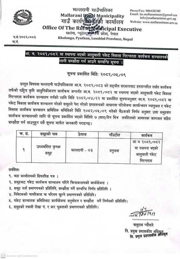 आ.व २०८१/०८२ मा स्थापना भएको आलुबाली पकेट विकास निरन्तरता कार्यक्रम सञ्चालनकोलागि सम्झौता गर्न आउने सम्बन्धी सूचना ।