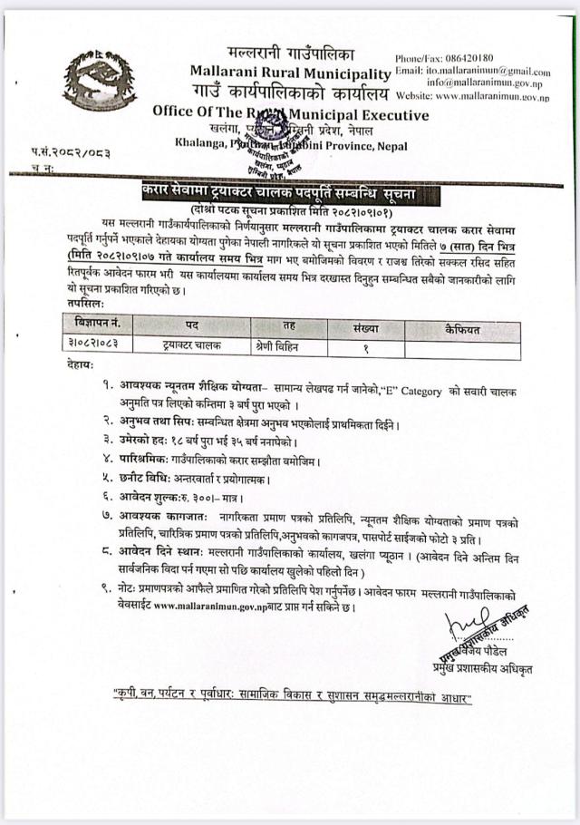 करार सेवामा ट्रयाक्टर चालक पदपूर्ति सम्बन्धी सूचना।
