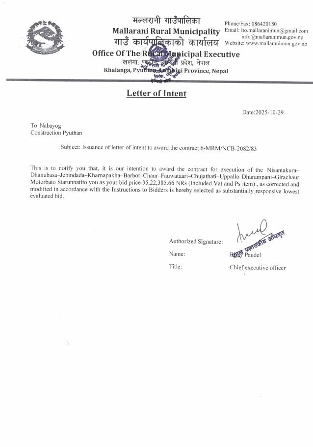 बोलपत्र स्विकृत गर्ने आशय तथा आर्थिक प्रस्ताव खोल्ने सूचना ।