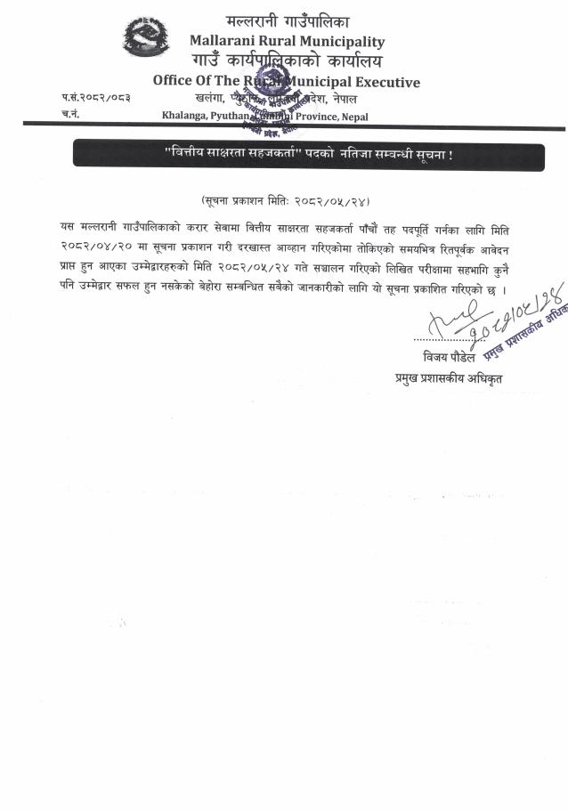 वित्तिय साक्षरता सहजकर्ता सेवा करारको अन्तिम नतिजा प्रकाशन सम्बन्धी सूचना ।