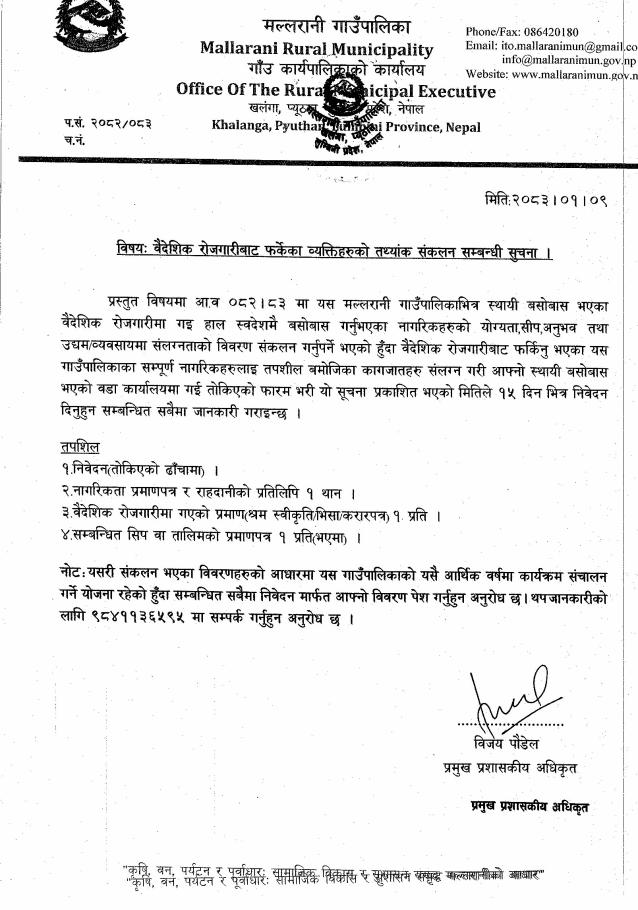 वैदेशिक रोजगारीबाट फर्केका व्यक्तिहरुको तथ्यांक संकलन सम्बन्धी सूचना ।