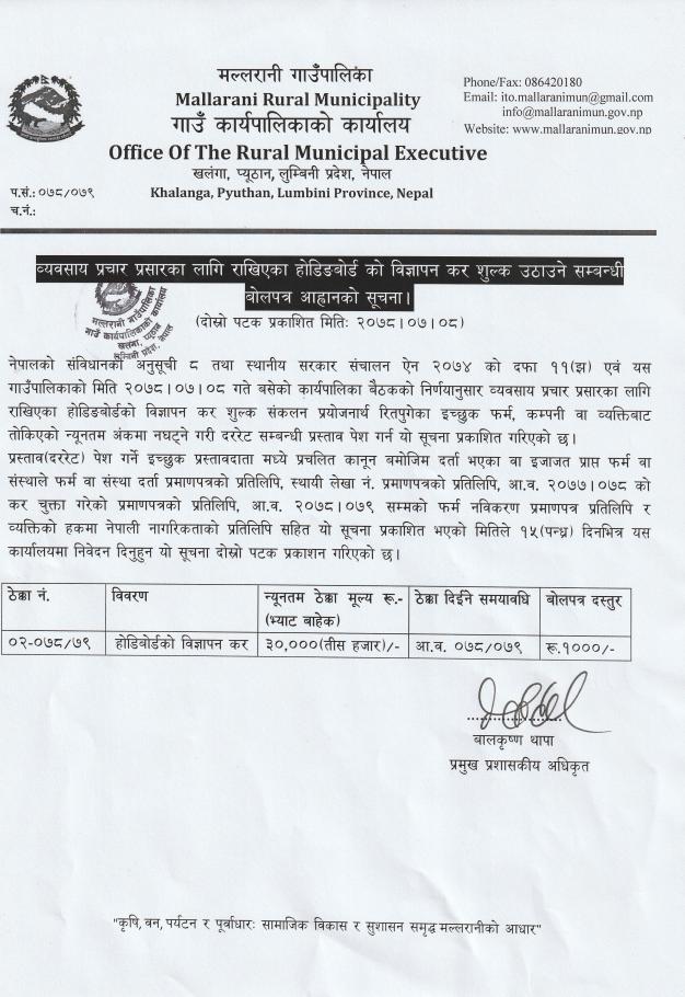 » व्यवसाय प्रचार प्रसारका लागी राखिएका होडिङ्गबोर्डको विज्ञापन कर शुल्क उठाउने सम्बन्धी बोलपत्र आवह्वान सम्बन्धी सूचना ।